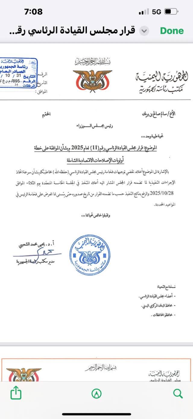 نتقدم بأصدق التهاني والتبريكات إلى فخامة الدكتور رشاد محمد العليمي، رئيس مجلس القيادة الرئاسي، وإلى أعضاء المجلس الرئاسي كافة، وكذلك إلى دولة رئيس مجلس الوزراء الاستاذ سالم بن بريك، بمناسبة صدور القرار رقم (11) لعام 2025م، الصادر عن الحكومة الشرعية اليمنية بالتنسيق مع مكتب رئيس المجلس الرئاسي.